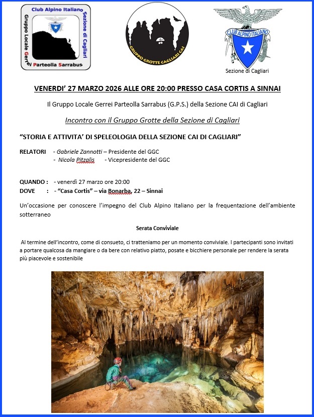 Il Gruppo Locale Gerrei Parteolla Sarrabus (G.P.S.) della Sezione CAI di Cagliari organizza per VENERDI’ 27 MARZO 2026 ALLE ORE 20:00 PRESSO CASA CORTIS A SINNAI un Incontro con il Gruppo Grotte della Sezione CAI di Cagliari come da depliant qui riportato.