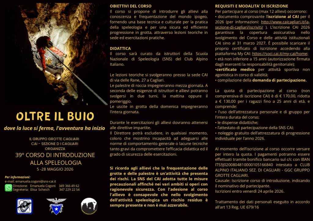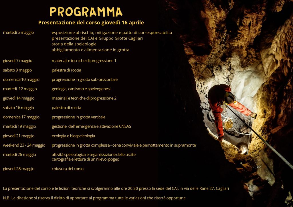 Il Gruppo Grotte Cagliari – CAI Sezione di Cagliari organizza il 39° CORSO DI INTRODUZIONE ALLA SPELEOLOGIA